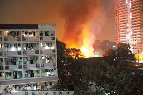 14日零时40分许,广西大学西校园6B女生宿舍的学生突然听到猛烈的爆炸声,争相跑到宿舍走廊查看,发现距离宿舍楼约50米的拱门商业服务点铺面失火,火苗足有两层楼高。