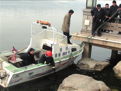 根据监控录像,警方和消防员在影像显示区域展开搜寻。河湖管理处派来一艘小艇,消防员开始上艇搜寻。几名同学在河岸上等候。