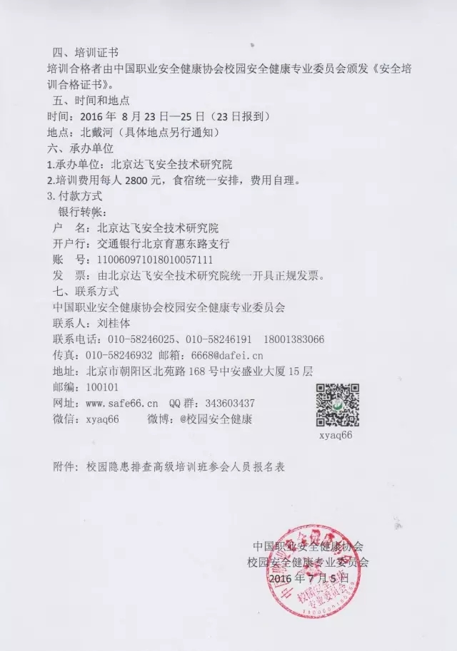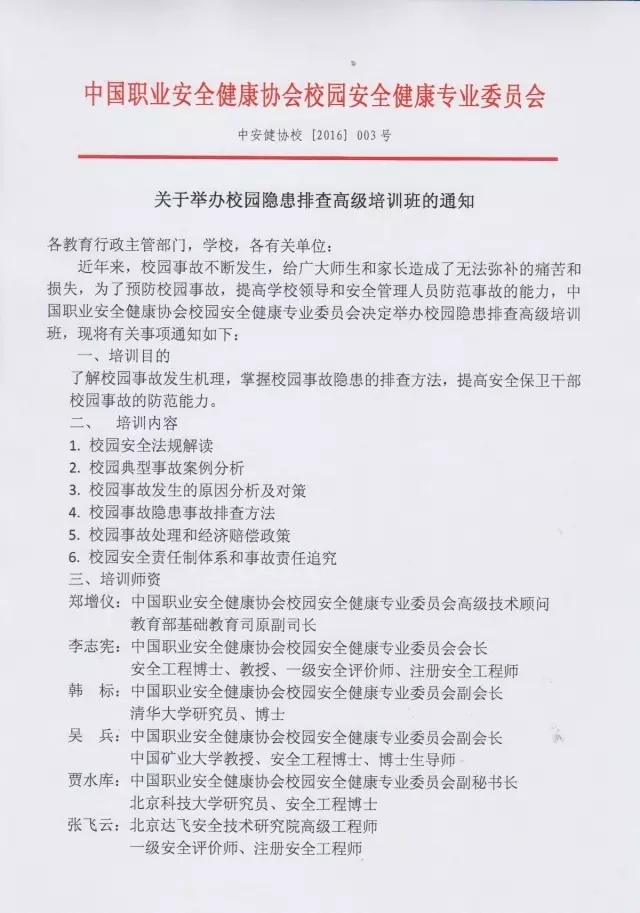 为了预防校园事故,提高学校领导和安全管理人员防范事故的能力,中国职业安全健康协会校园安全健康专业委员会将于8月份在北戴河举办校园隐患排查高级培训班。