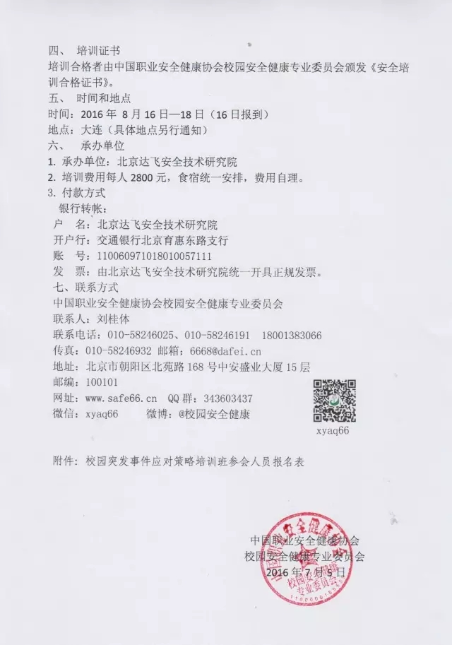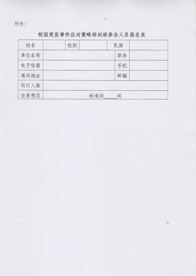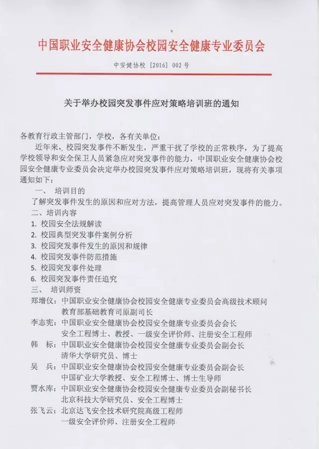 为了避免校园突发事件,提高学校领导紧急应对防范事故的能力,中国职业安全健康协会校园安全健康专业委员会将于8月份在大连举办校园突发事件应对策略培训班。