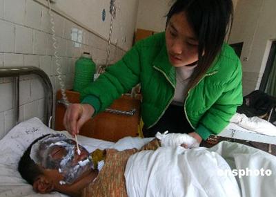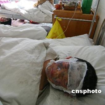 06年12月15日,一名在煤气爆燃事故中头部受伤的学生在湖南娄底中心医院接受治疗。12月14日下午1时40分许,3名小学生结伴上学经过湖南娄底大科街时,地下煤气管道突然发生爆燃,造成2名学生脸部、手部不同程度烧伤,1名学生被爆炸产生的气浪摔伤,3名学生被送往医院接受治疗。事故原因在进一步调查中。